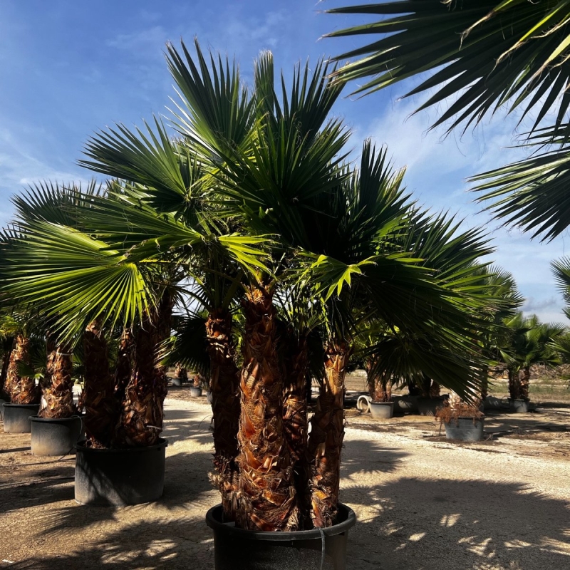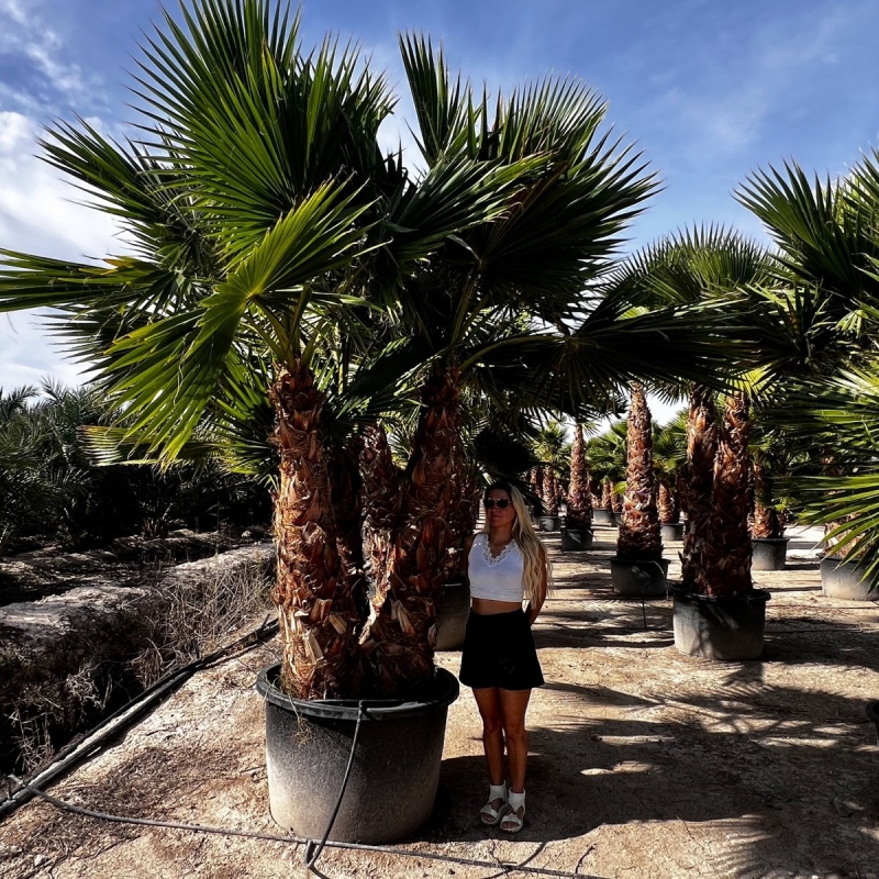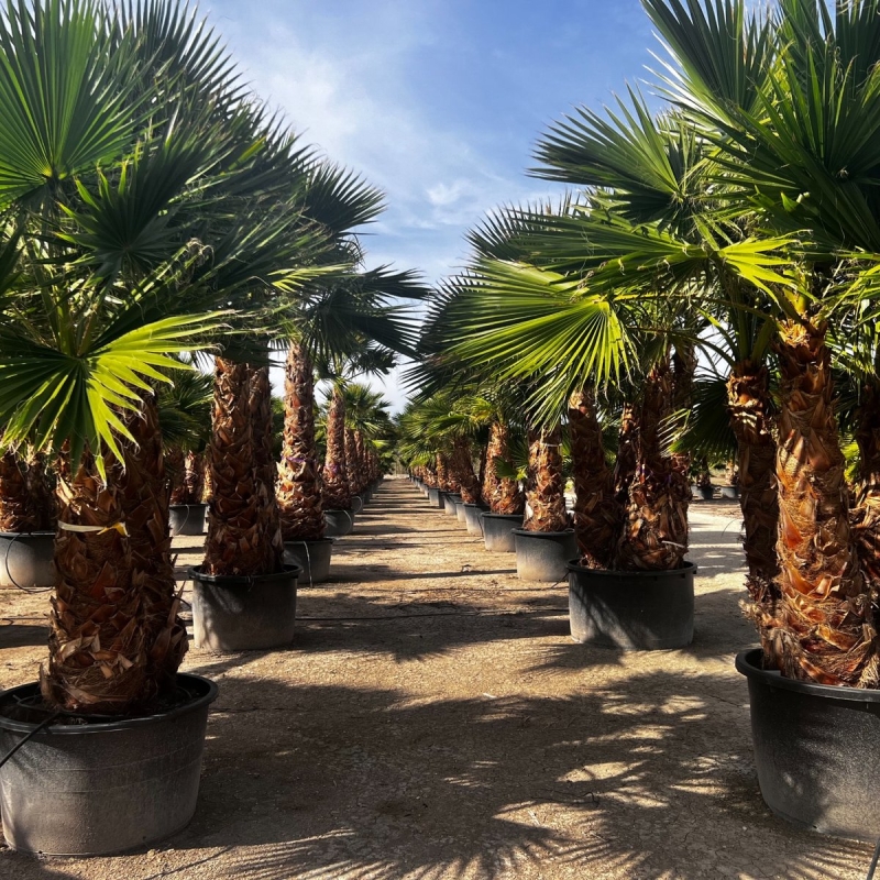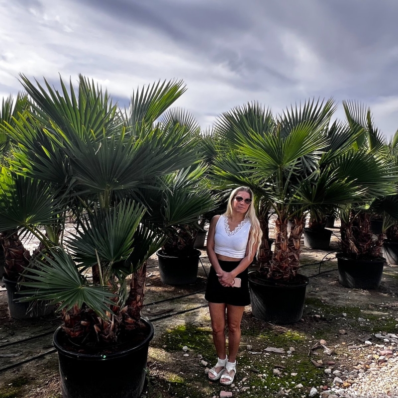 Die Washingtonia robusta zählt zu den am schnellsten wachsenden Palmenarten weltweit. Selbst als Großpflanze entwickelt sie zügig weitere Stammhöhe und Kronenvolumen – ideal für Kunden, die nicht jahrelang warten möchten.